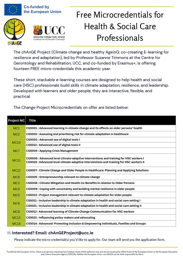 For further details, please contact chAnGEProject@ucc.ie indicating which of the micro-credentials listed are of interest to you. Our administrator will revert to you with an application form.