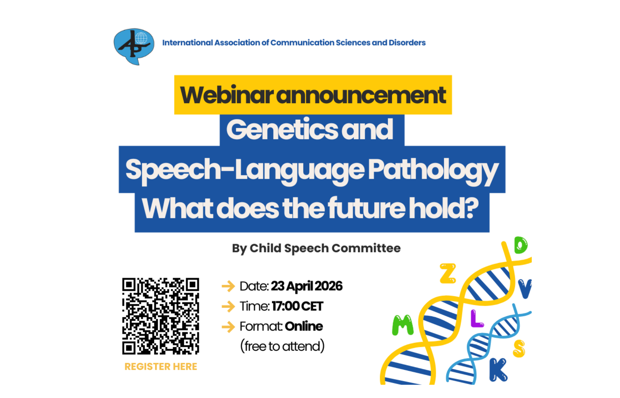 The Child Speech Committee of the International Association of Communication Sciences and Disorders are holding a webinar : Genetics and Speech and Language Therapy: What does the future hold?