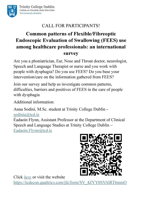 As part of my studies, I am investigating common patterns of use of Flexible/Fibreoptic Endoscopic Evaluation of Swallowing (FEES), as well as risks and benefits as perceived by professionals through an online survey. The intended participants are Phoniatrics, Ear, Nose and Throat doctors, Neurologists, pediatric Neurologists, Speech and Language Therapists and Nurses who perform and/or work with information gathered by FEES, and are involved in the care of people with dysphagia.