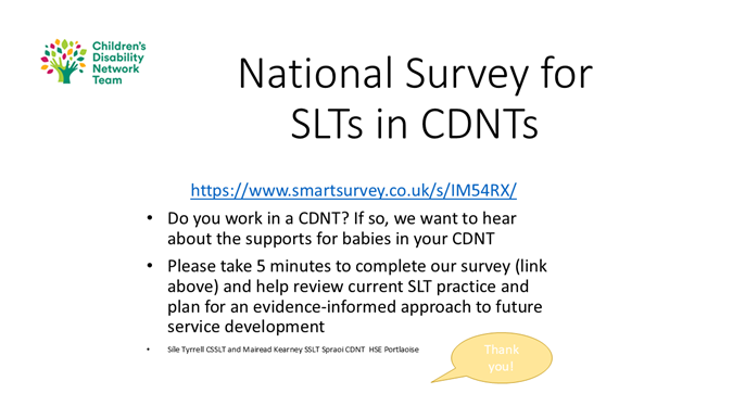 The purpose of the survey is to identify and describe the clinical activity that SLTs engage in with babies under 1 in CDNTs. Babies under 1 are considered to include babies of a chronological age of 12 months OR a corrected age of 12 months. In keeping with IASLT Standards document (2026) the term 'Eating, Drinking and Swallowing' (EDS) is used. This is used as an equivalent term in place of 'Feeding Eating Drinking and Swallowing' (FEDS).